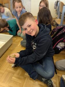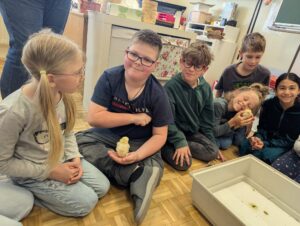Am Freitag, den 09.05.2025 wurden die Schülerinnen und Schüler der 2.Klasse von frisch geschlüpften Küken der Familie Riedl überrascht. Die Kinder und Lehrerinnen der Schule haben sich sehr über den Besuch gefreut. Die Jungvögel wurden nicht nur beobachtet, sie wurden auch gestreichelt und gehalten. Der Besuch hat auch perfekt zum Abschluss des Sachunterrichtsthemas „Das Huhn“ gepasst, so konnten die Kinder praxisnahe ihr theoretisches Wissen anwenden und vertiefen. Besonders spannend war es für die Kinder, die Entwicklung der Küken hautnah mitzuerleben – vom Ei bis zum flauschigen Küken. Mit großer Begeisterung und viel Einfühlungsvermögen gingen sie auf Tuchfühlung mit den kleinen Tieren. Die Begegnung war nicht nur lehrreich, sondern auch ein unvergessliches Erlebnis, das den Kindern noch lange in Erinnerung bleiben wird. Ein herzliches Dankeschön an die Familie Riedl für diese besondere Erfahrung!