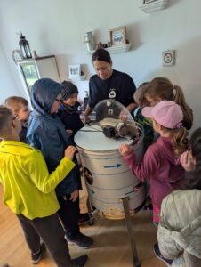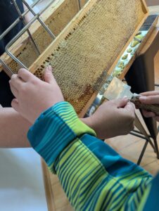Wir beobachteten Bienen beim Ausfliegen aus dem Stock und bei der Rückkehr mit vollen Pollenhöschen. Besonders spannend war die Honigverkostung direkt aus den Waben – frischer geht’s nicht! Die Kinder durften wichtige Begriffe rund um das Bienenleben klären, den Bienenstock mit eigenen Händen zusammenbauen und sogar die Geräte des Imkers ausprobieren.